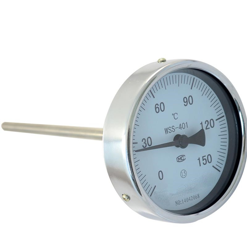 MIK-WSS-401軸向不銹鋼雙金屬溫度計是將繞成螺紋旋形的熱雙金屬片作為感溫器件,檔溫度發生變化時感溫器件的自由端隨之發生轉動,帶動細軸上的表盤指針發生角度變化,標度盤上指針對應相應的溫度,雙金 屬溫度計的有點在于相應速度快、體積小、線性度以及穩定性好。